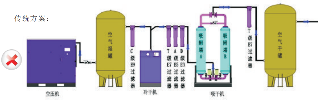 传统方案(过滤器+冷干机+双塔式吸干机)